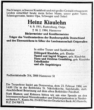 Todesanzeige Heinz Kiaulehn