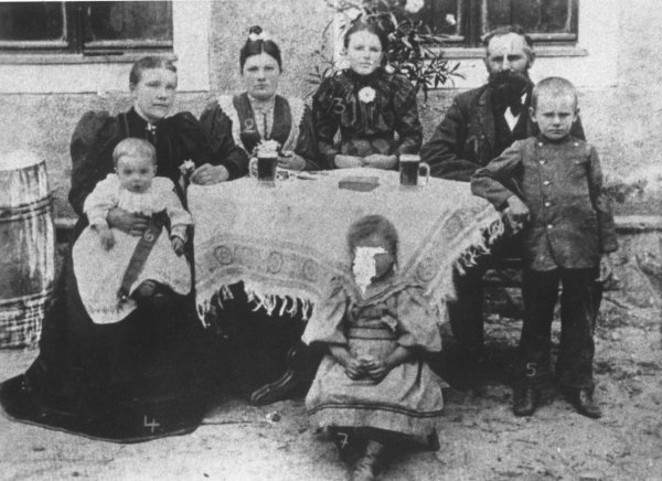 Abb. 92. VIII 143 Friedrich Loyal (1840-1907), rechts, Kinder aus 1. Ehe, Mitte oben: IX 234 Johanna Loyal; IX 235 Matha Loyal (1883-1969); links 2. Frau von Friedrich L. geb. Reckewitz (1866-1945); Kinder aus 2. Ehe, XI 237 Eugen Loyal rechts vor Vater; IX 238 Richard Loyal links auf dem Schoß der Mutter; IX 236 Erna Loyal unten.